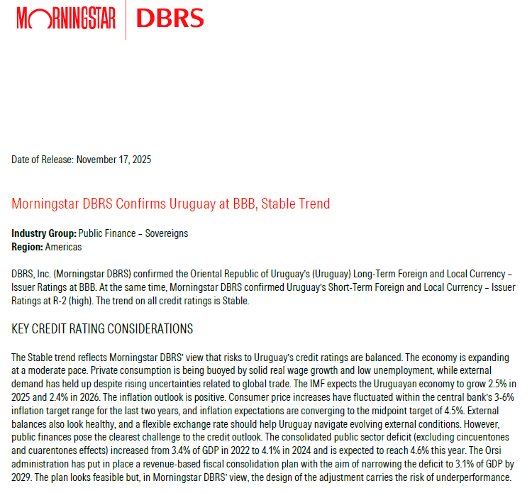 On November 17, 2025, the rating agency affirmed Uruguays foreign-currency sovereign debt rating at BBB, with a stable outlook. The decision is supported by predictable macroeconomic policies and strong institutions, which offset the country's moderate productivity levels, its partially dollarized financial system, and its limited financial depth.