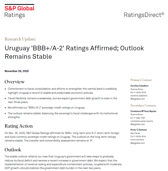 El 26 de noviembre de 2025, S&P confirmó sus calificaciones soberanas en moneda local y extranjera de largo plazo en BBB+ y de corto plazo en A-2 de Uruguay. La perspectiva de las calificaciones de largo plazo se mantienen estables.