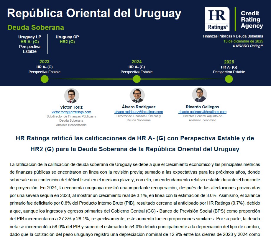 December 15th, 2025. HR Ratings mantained A- to Uruguay's sovereign long-term debt, with stable outlook.