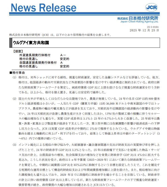 26 de diciembre de 2025. La calificadora JCR mantuvo la calificación de A- para la deuda soberana de Uruguay de largo plazo en moneda extranjera y de A para la deuda soberana de largo plazo en moneda local, con perspectiva estable. Acceda aquí a la versión en japonés del reporte.