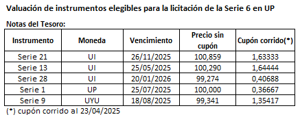 - Valuación de instrumentos elegibles para la licitación de la Serie 6 en Unidades Previsionales (UP)