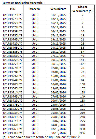 24 de octubre de 2025. Se informa los títulos elegibles para la licitación de Notas del Tesoro en Unidades Indexadas a realizarse el día de martes 28 de octubre a las 14:30.