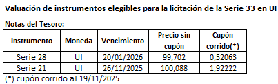 Valuación de instrumentos elegibles para la licitación de la Serie 33 en Unidades Indexadas (UI)