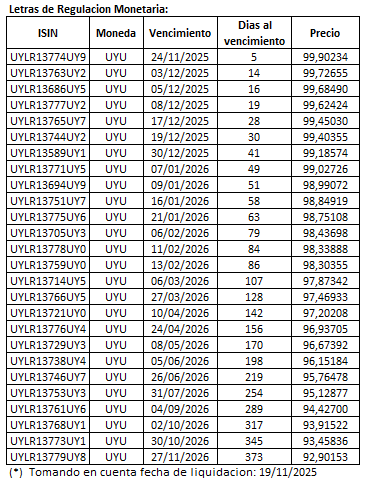 18 de noviembre de 2025. Se informa la valuación de los títulos elegibles para la licitación de Notas del Tesoro en Unidades Indexadas a realizarse el día de hoy a las 14:30.