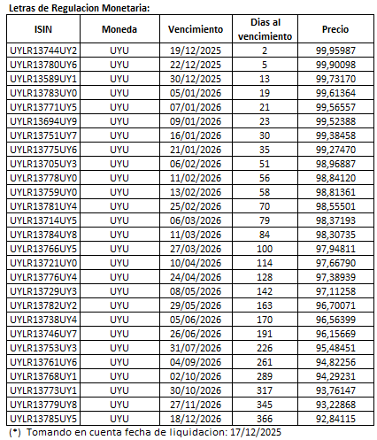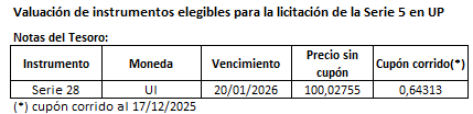 16 de diciembre de 2025. Se informa la valuación de los títulos elegibles para la licitación de Notas del Tesoro en Unidades Previsionales a realizarse el día de hoy a las 14:00.