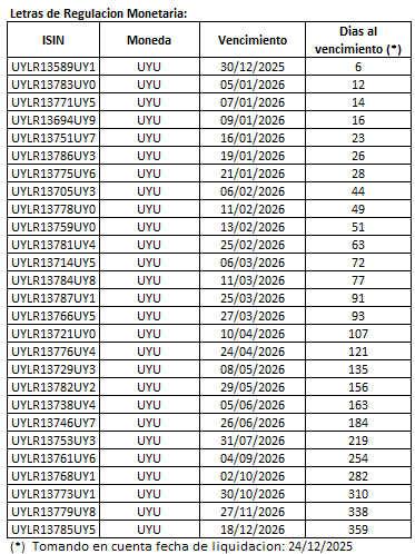 19 de diciembre de 2025. Se informa los títulos elegibles para la licitación de Notas del Tesoro en Unidades Indexadas a realizarse el día martes 23 de diciembre a las 14:00.