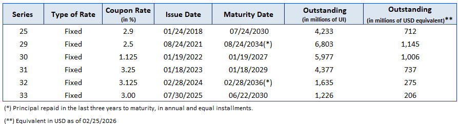 UIs are inflation-indexed monetary units. The UI is calculated by the National Institute of Statistics (Instituto Nacional de Estadistica or INE) and is published monthly in advance for each day from the 6th day of a month to the 5th day of the following month. The UI is available on Bloomberg by typing “URUIURUI <INDEX> <GO>” (or “URUDUD <INDEX> <GO>”. The UI changes on a daily basis to reflect changes in the consumer price index (Indice de Precios al Consumo or IPC), which is measured by the INE. The UI for each day is set in advance based on changes in previous months’ inflation.